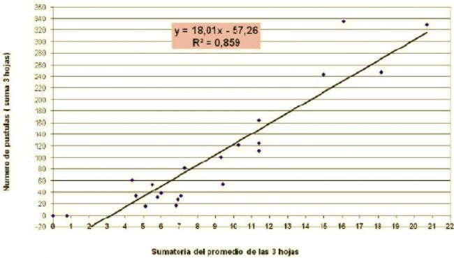 Gráfico 2. Correlación entre el número de pústulas y la sumatoria de cuadrados ocupados por pústulas en la regla, para las tres hojas de la espiga. Fuente: Ensayos CREA, Martín Sánchez.