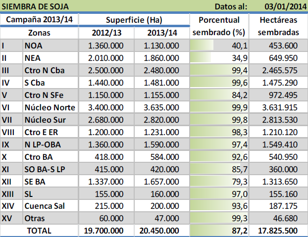 El avance nacional de siembra asciende al 87,2 % de la superficie proyectada en 20.450.000 hectáreas , mostrando así un progreso intersemanal de 3,9 % y un adelanto interanual que ahora es de 2,3 puntos porcentuales. A lo largo de toda la región agrícola ya se sembraron más de 17,8 millones de hectáreas, y se espera que luego de las lluvias registradas durante los días previos se agilice la incorporación de los cuadros remanentes.