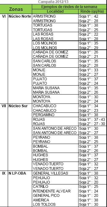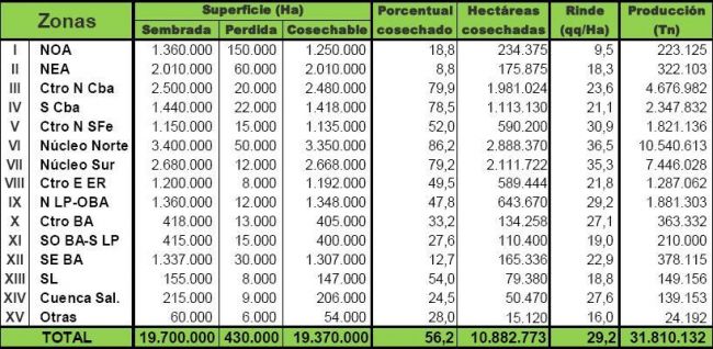 A pesar de los recortes recientemente explicados, el área implantada entre ambas zonas (NOA+NEA) iguala la superficie sembrada en el Núcleo Norte, en donde las pérdidas de área son escasas y los rendimientos recolectados superaron ampliamente nuestras expectativas como las de muchos productores. Esto último permite compensar parcialmente las pérdidas mencionadas sobre las provincias del norte, pero afortunadamente otras regiones tales como el Núcleo Sur y el Norte de La Pampa junto al Oeste de Buenos Aíres, también sorprenden por las buenas productividades que están obteniendo a la fecha. En conclusión todas las pérdidas que fuimos relevando a medida que avanzó la campaña, se fueron compensando con las elevadas productividades aportadas en gran parte de la franja central de la región agrícola y ello nos permite actualmente sostener nuestra proyección de producción nacional en 48.500.000 toneladas.