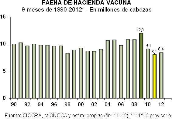 En septiembre de 2012 se faenaron alrededor de 965.000 cabezas de ganado vacuno, cantidad que resultó 2,8% superior al promedio de los primeros nueve meses del año y 1,8% mayor a la registrada en el noveno mes de 2011. En términos absolutos, la faena habría crecido en 17 mil cabezas con relación a un año atrás.
