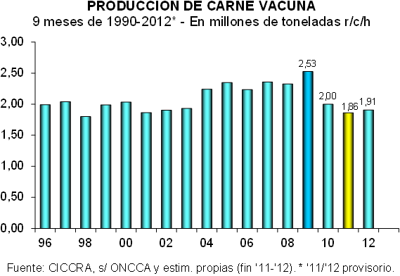 Y en los primeros nueve meses de 2012 la producción habría ascendido a 1,908 millones de tn r/c/h y habría crecido 2,5% anual. En este caso la expansión interanual de la producción habría sido de casi 46.000 tn r/c/h. El peso promedio de la res en el gancho habría registrado una pérdida de alrededor de 2% anual, al pasar de 231 kg r/c/h a 226 kg r/c/h.