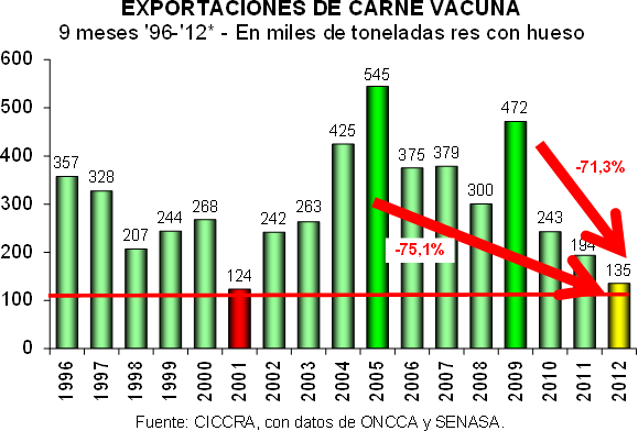 Los ingresos totales por exportaciones de carne vacuna fueron de US$ 727,4 millones en enero-septiembre de 2012, es decir 25,0% menores a los registrados en enero-septiembre de 2011 y 21,8% menores a los de igual lapso de 2005. Y la facturación por embarques de menudencias y vísceras ascendió a US$ 155,7 millones y resultó 6,4% inferior a la alcanzada en igual período de 2011.