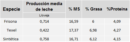 Cuadro 1: Producción media diaria de leche (PMD), porcentaje de materia seca (%MS), grasa (%G) y proteína (% P) en promedio para Frisonas, Texel y Raza Sintética.