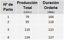 Los registros obtenidos hasta el momento, en producción de leche y duración de la lactancia para ovejas de la raza sintética Frisona x Texel en los distintos partos, se presentan en el cuadro 2. La producción total de leche corresponde a la obtenida durante el período de ordeñe, luego del destete total de los corderos a los 30-45 días.
