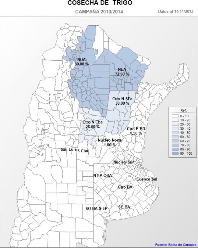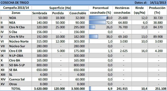 Hacia el Núcleo Sur los cuadros de trigo habían comenzado con escasa oferta hídrica durante la fase vegetativa. No obstante, gracias a las precipitaciones de los últimos meses el cultivo logró recuperarse notoriamente, tal es así que en algunas regiones puntuales se esperan rindes superiores a los 50 qq/Ha. Otra zona que registró una marcada recuperación del cultivo es el Oeste de Buenos Aires y Norte de La Pampa. Las lluvias llegaron a tiempo para revertir el estrés hídrico, y de esta manera el cultivo transita desde fin de floración a comienzo de llenado de grano en buenas condiciones.