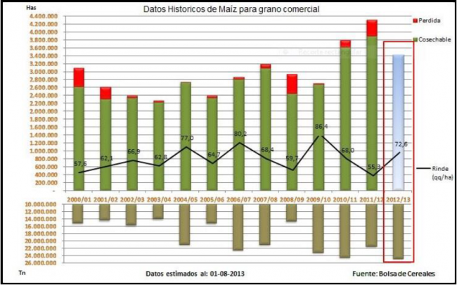 Para la campaña en curso (2012/13) nuestra proyección de producción se mantiene en 24.800.000 toneladas, con un rendimiento medio de 72,6 qq/Ha. De concretarse esto, registraría la mejor cosecha de la historia del maíz argentino, pero no así respecto del rendimiento medio nacional. Para este caso, se ubicaría en un cuarto escalón detrás de las campañas 2009/10= 86,4 qq/Ha; 2006/07= 80 qq/Ha; 2004/05= 77 qq/Ha.