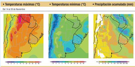 Gran parte del área agrícola observará temperaturas máximas superiores a 30°, con focos de más de 35° y 40°, que se ubicarán sobre la mayor parte del Paraguay, el oeste de Mato Grosso do Sul, el este de Salta, el norte de la Región del Chaco, la mayor parte de Santiago del Estero, el sur de Catamarca y el norte de Cuyo.