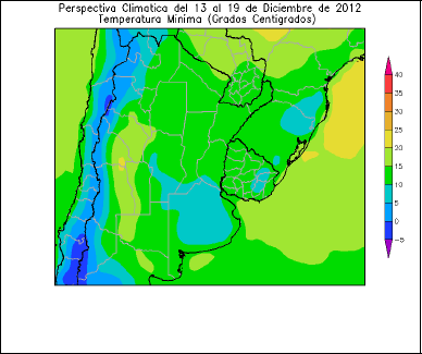 • El centro del NOA, el centro de Cuyo, la mayor parte de la Región Pampeana, el sur de la Mesopotamia y la mayor parte del Uruguay observarán temperaturas mínimas entre 10 y 15 ºC, con un foco de valores menores sobre las serranías bonaerenses, y registros mayores sobre el extremo sur de Buenos Aires.