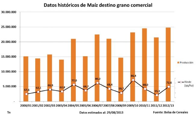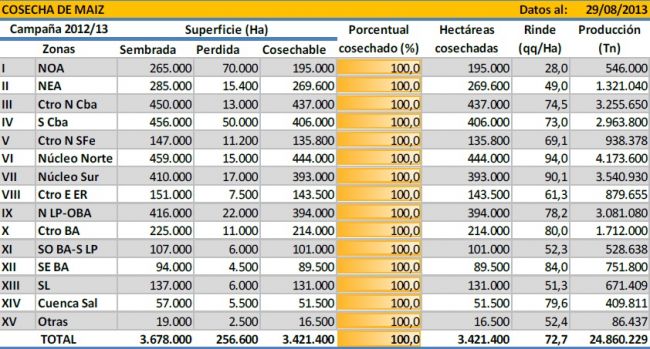 El avance en la cosecha registrado durante los últimos siete días, nos permite dar por finalizada la campaña 2012/13 de maíz con destino grano comercial. A pesar de que todavía puedan verse algunos cuadros en pie sobre el extremo norte de Córdoba, Centro-Este de Entre Ríos y en el Sudeste de Buenos Aires, esta superficie no es significativa. Por lo tanto, la campaña 2012/13 finaliza con una producción de 24.800.000 de toneladas, habiéndose implantado 3.678.000 millones de hectáreas. El rendimiento promedio nacional finalizó en 72,7 qq/Ha y las pérdidas de área han alcanzado un valor cercano al 7 %.