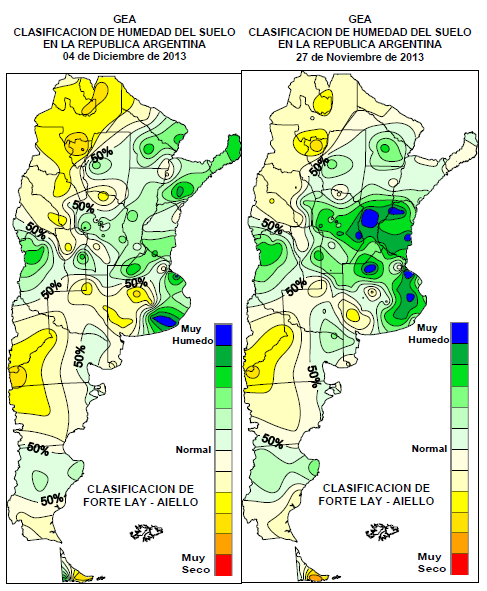 El norte bonaerense fue notablemente afectado por los intensos vientos y hubo daños en el follaje de los cultivos y algunos lotes fueron alcanzados por la caída de granizo. En Los Cardos y El Trébol hubo fuertes volúmenes de agua en áreas particulares que superaron los 50 mm pero en general la región recibió entre 0 y 10 mm. Las temperaturas máximas fueron muy superiores a los parámetros normales y se ubicaron entre 35° y 38ºC. En Córdoba se superaron los 40ºC como en Idiazábal. A pesar de escasas precipitaciones y la alta evapotranspiración se mantienen buenas reservas de humedad exeptuando algunas zonas de Córdoba con reservas regulares. Hay nuevos pronósticos de lluvias para la región a partir del domingo.