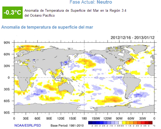 En diálogo con Agritotal.com, el director del Instituto de Climatología del INTA, el ing. Pablo Mércuri calmó las aguas asegurando que esta campaña 2012-2013, estrictamente hablando, nunca fue niño (porque como mínimo debe estar un trimestre en esa fase) pero tampoco será niña, sino que las condiciones están dadas para ser un año neutro. Además insistió en “no tratar de ser gurúes y entender las limitaciones de la climatología” en clara alusión a las versiones periodísticas que aseguraban que estamos en un año Niño y que se iba a complicar la cosecha como tambien aclaró que “las estimaciones acerca de que se pierden una cantidad de kilos por día sin lluvia son totalmente infundadas y no responden a ningún criterio agronómico ni técnico”