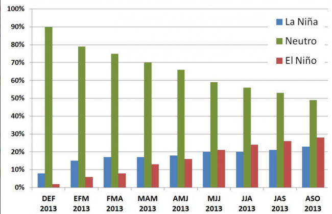 Probabilidad de ocurrencia de fase Niño, Niña o Neutro. |
