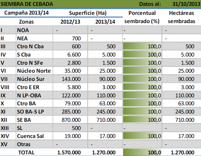 Sin embargo, hacia el sur del área agrícola nacional, en donde se nuclea más del 80 % de la cebada implantada en el país, la situación del cultivo es favorable. Pese a retrasarse en su normal desarrollo por reiteradas heladas durante la fase vegetativa, el cultivo logró recuperarse y a la fecha se puede apreciar un estado de bueno a muy bueno. El grueso de los cuadros transita desde plena espigazón a inicio de llenado de grano (grano lechoso) con perspectivas de rendimiento a cosecha de buenos a muy buenos.