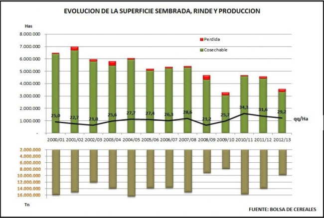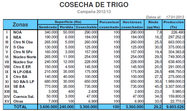 Habiéndose recolectado los últimos cuadros de este cereal en el Sudeste, Sudoeste y Centro de Buenos Aires, damos por finalizada la campaña triguera 2012/13 con una producción acumulada de 9.800.000 toneladas. El volumen registrado es el tercero más bajo en las últimas trece campañas; en cuanto a la superficie implantada, es la segunda más baja analizando el mismo período (menor área triguera: 2009/10, 3.3 MHa). De forma particular, también es muy lejana de las 6-7 MHa sembradas a principio de la década.