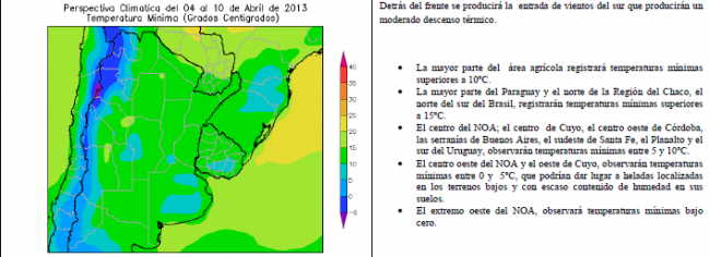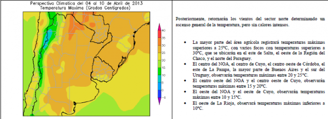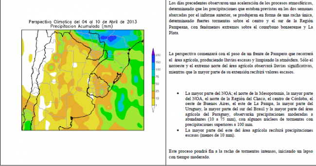 Los días precedentes observaron una aceleración de los procesos atmosféricos, determinando que las precipitaciones que estaban previstas en las dos semanas siguientes, se produjeran en forma de una racha única, determinando fuertes tormentas sobre el centro y el sur de la Región Pampeana, con fenómenos extremos sobre el conurbano bonaerense y La Plata. La perspectiva comenzará con el paso de un frente de Pampero que recorrerá el área agrícola, produciendo lluvias escasas y limpiando la atmósfera. Sólo el noroeste y el extremo norte del área agrícola observará lluvias significativas, mientras que la mayor parte de su extensión recibirá valores escasos.