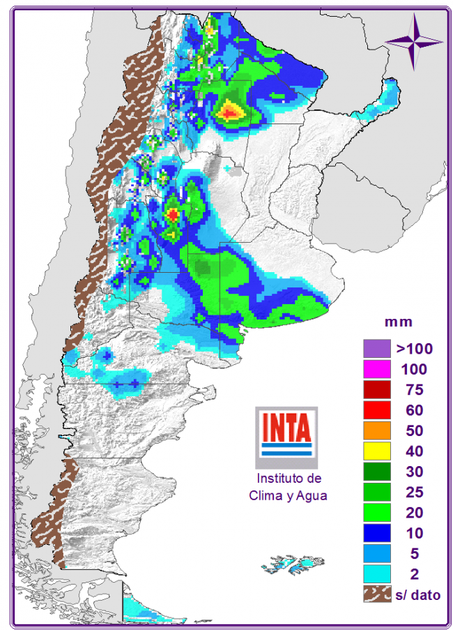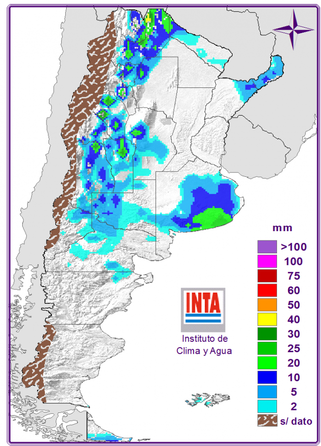 La llegada de un frente frío sobre el centro del país provocará tiempo inestable con probables lluvias y tormentas en dicha región y sobre el sur del Litoral, incluyendo las provincias de Cuyo y zonas de Córdoba. Se espera un marcado descenso de las temperaturas junto con un cambio de viento hacia el sector sur. Sobre el NOA también se espera tiempo inestable especialmente en horas de la tarde-noche. El NEA en tanto registrará temperaturas cálidas en la tarde con cielo con nubosidad variable.