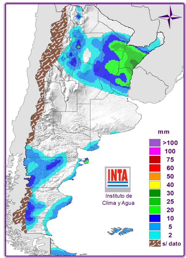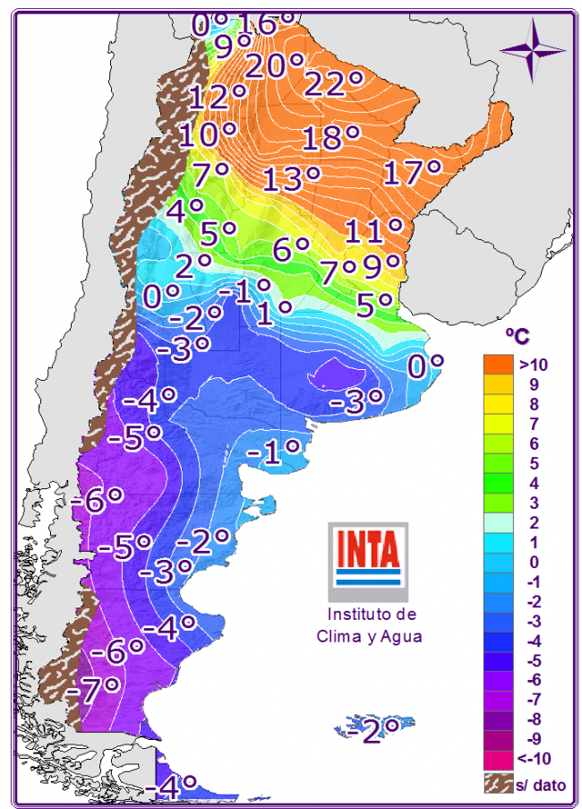 Se prevé la probabilidad de lluvias y tormentas asiladas sobre Córdoba, Santa Fe, Entre Ríos, el NEA y algunas regiones del NOA con posterior descenso de las temperaturas debido al pasaje de un frente frío. Se espera una irrupción de aire frío desde el sur con intensos vientos y precipitaciones en forma de agua, nieve o agua/nieve sobre la región patagónica y sur pampeano. Se registrarían heladas generalizadas, algunas podrían ser intensas sobre el sur pampeano, cuyano y región Patagónica.