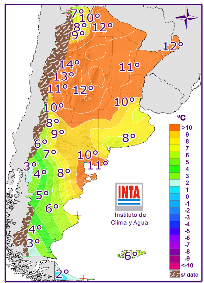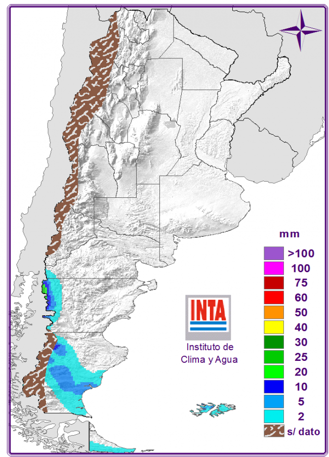 Habría buenas condiciones del tiempo sobre el centro y norte del país acompañadas por ascenso de las temperaturas y vientos moderados del sector norte. Sobre la Patagonia se espera el pasaje de una perturbación desde el Pacífico que generaría nubosidad con lluvias y nevadas aisladas sobre zonas cordilleranas y Santa Cruz.
