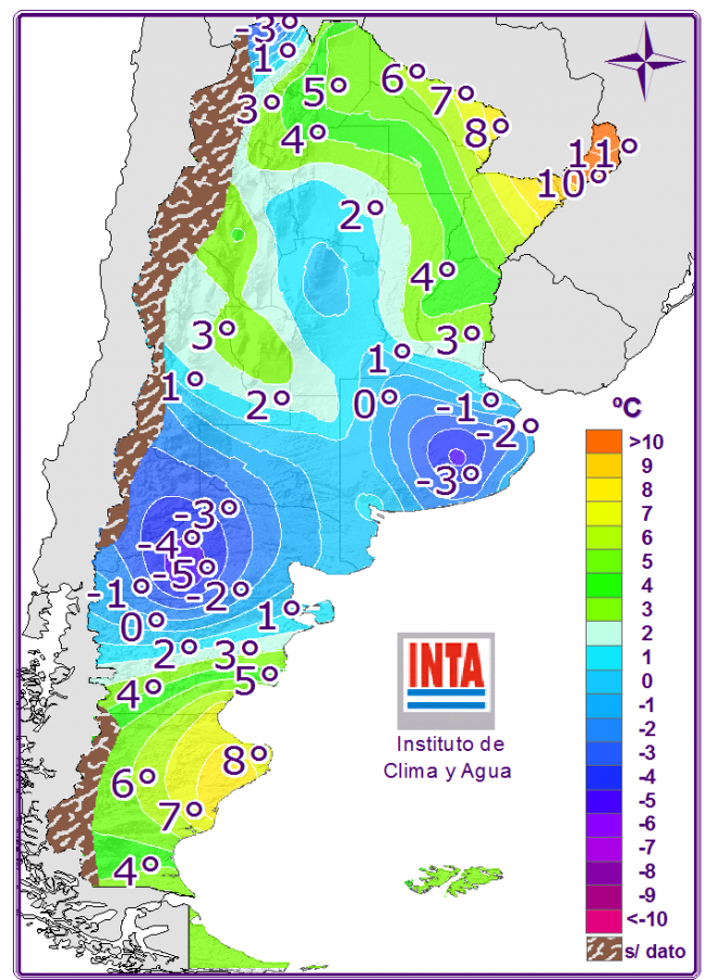 Habría condiciones de tiempo inestable sobre Misiones. Sobre el resto del norte y centro del país se mantendría tiempo bueno y muy frío; se podrían registrar helada generalizadas sobre el sur pampeano y cuyano y norte patagónico. Sobre el extremo sur habría nubosidad variable con tiempo bueno y leve ascenso de las temperaturas mínimas.