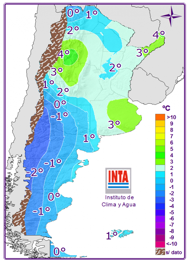 Se espera tiempo bueno y frío sobre la mayor parte del centro y norte del territorio con ascenso de las temperaturas mínimas pero aún con valores menores a los 5°C, provocado por el ingreso de una masa de aire polar. Sobre la región patagónica se espera nubosidad en ascenso y vientos intensos del sector noroeste con ascenso de las temperaturas; podrían registrarse algunas lluvias y nevadas sobre zonas cordilleranas de Santa Cruz.
