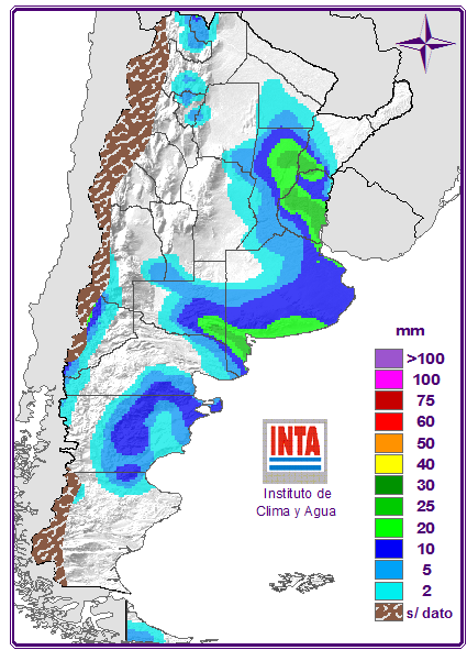 Se espera el pasaje de un sistema frontal que se desplazaría desde el norte patagónico hacia el noreste argentino generando lluvias y tormentas aisladas sobre el centro-este y NEA. En el norte argentino habría tiempo caluroso y húmedo con nubosidad en aumento. En el centro y norte patagónico podrían registrarse algunas lluvias y nevadas, especialmente sobre zonas cordilleranas; se espera descenso de las temperaturas.