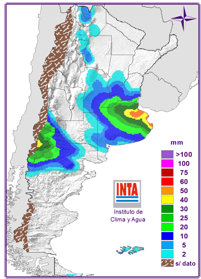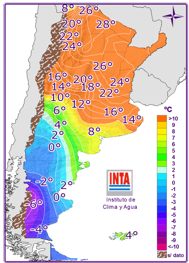 Continuaría la probabilidad de lluvias con tormentas de variada intensidad sobre el centro-este que se extendería al centro-oeste y el NOA con descenso de las temperaturas mínimas debido al pasaje de un frente frío. Habría probables lluvias y nevadas sobre el norte patagónico; algunas podrían ser intensas. Hacia el sur del país habría marcado descenso de las temperaturas y poca nubosidad.