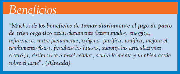 En este camino se inscribe este producto que es furor en el Primer Mundo, definido como jugo de pasto de trigo orgánico (wheatgrass). Sus cultores aseguran que la clave de su aceptación está en el poder de la clorofila, la sustancia que condensa el poder del sol. Y lo consideran un formidable energizante, capaz de desintoxicar las células del cuerpo y fortalecer el sistema inmunológico. Para quienes creemos en la fuerza de la naturaleza la idea tiene, al menos, bases lógicas.