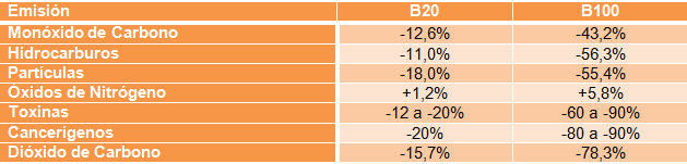 Otro tópico a considerar cuando se habla de combustibles es el efecto que los mismos pueden causar en el medio ambiente y los potenciales impactos asociados que se transmitirán a la sociedad. En este contexto puede decirse que el uso de biodiesel en reemplazo o como parte constitutiva de una mezcla diesel-biodiesel puede disminuir las emisiones de gases contaminantes a la atmósfera, como los óxidos de nitrógeno (NOx) o dióxido de carbono (CO2). En la siguiente tabla se muestran los porcentajes de reducción de emisiones con respecto al diesel puro (B0).