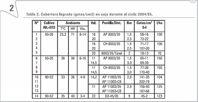 Los resultados obtenidos en las primeras evaluaciones realizadas a partir del año 2000, mostraban la dificultad en lograr una buena cobertura en cultivos de soja cerrados. En la Tabla 1, se muestran algunos de esos valores.