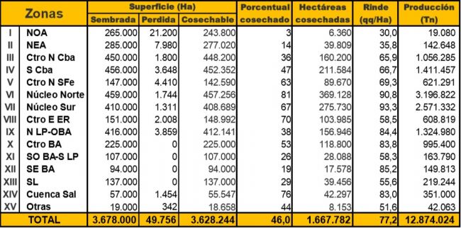 Durante los últimos siete días gran parte de las labores de recolección de cuadros tardíos y/o de segunda ocupación se concentraron sobre las zonas Núcleo Norte y Sur, Centro Norte y Sur de Córdoba, Centro-Norte de Santa Fe y Centro-Este de Entre Ríos. En todas ellas se trillaron más de 100 mil hectáreas con productividades que registran un promedio de 63,7 qq/Ha.