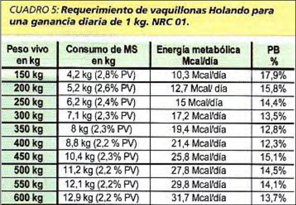 En el Cuadro N° 5 están resumidos los requerimientos nutricionales de una ternera en las distintas etapas, expresados en materia seca (MS), energía y proteína para producir 1 kg de carne.