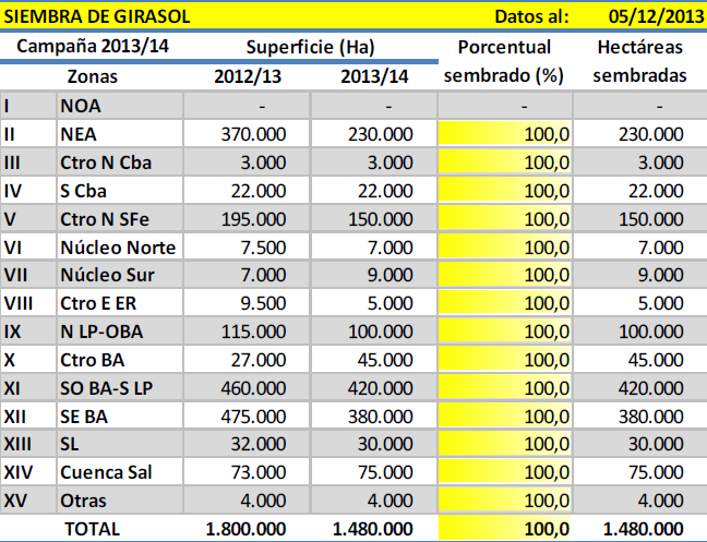 Luego de registrarse precipitaciones de escasa a moderada intensidad durante la semana previa, en la región Sudoeste de Buenos Aires se pudo retomar la siembra de forma fluida, y de esta manera culminar con la incorporación de aquellos cuadros que estaban pendientes. De esta forma, se da por finalizada la siembra de girasol a nivel nacional, elevando el área implantada a , cifra que refleja una caída interanual de 1.480.000 hectáreassuperficie próxima al -18 % (campaña 2012/13: 1,8 MHa).