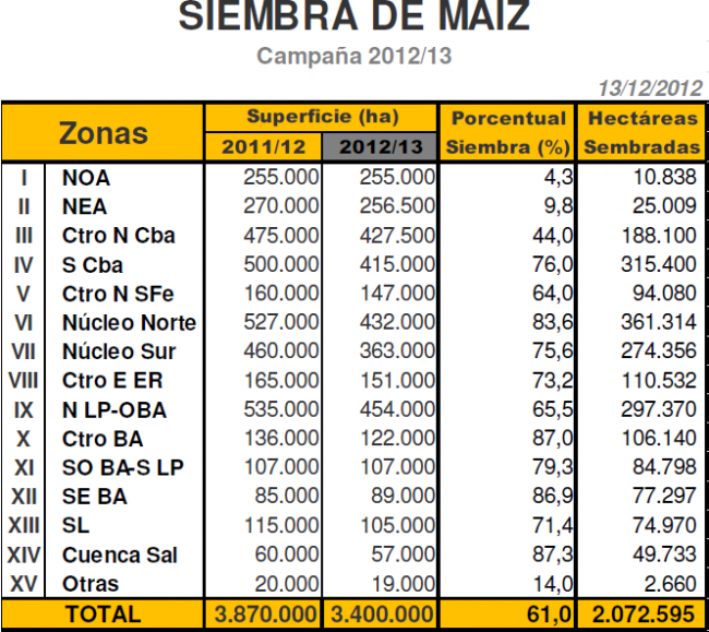 Aún se reportan zonas como el centro y oeste de Buenos Aires y el sudeste de Córdoba en donde los excesos hídricos, causados por las constantes lluvias registradas, no permiten el ingreso de las maquinarias a los lotes para poder realizar las labores pertinentes de siembra. Los cuadros de maíces tempranos presentan muy buenas condiciones en casi todas las zonas del área agrícola nacional en donde fueron implantados. Si bien las continuas lluvias registradas desde agosto hasta noviembre y lo que va de diciembre retrasaron la siembra y perjudicaron los campos bajos, han favorecido los cuadros que presentan maíces de primera ocupación.