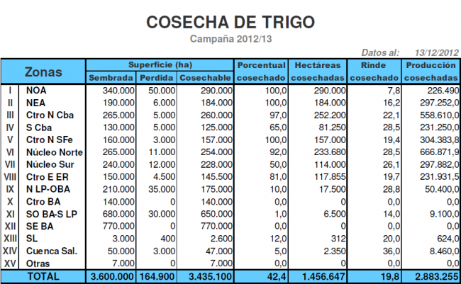 En consecuencia, a una semana de iniciarse la cosecha en los núcleos trigueros más importantes del país, los resultados previstos en estas dos regiones no alcanzan a suplir las fuertes caídas de rinde relevadas en el resto de la región agrícola nacional. Bajo este contexto, ajustamos nuestra proyección de producción a 9.800.000 toneladas, marcando un recorte de -320.000 toneladas en comparación a nuestra anterior publicación y una merma de -30 % en comparación al ciclo previo (Campaña 2011/12: 14 MTn).