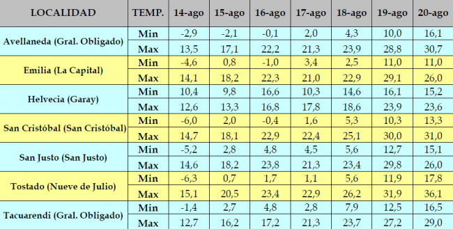 Los cultivares de trigo, ciclos largos y medio, continúan su desarrollo sin inconvenientes; las perspectivas de crecimiento de los mismos son buenas, hasta la fecha. Distinta realidad presentan los de ciclo tardío o corto, pues la disponibilidad de agua útil es escasa, en gran parte del área. Ante esta situación se observan cultivares con síntomas de déficit hídrico, con problemas para el cultivo, de la campaña 2013. Las temperaturas mínimas registradas oscilaron entre – 6,3ºC y 17,8ºC y las máximas entre 12,6ºC y 36,1ºC.