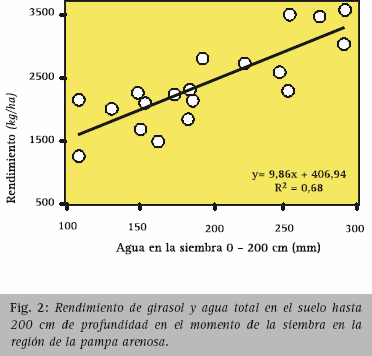 El cultivo antecesor, las labranzas y los barbechos son condicionantes del almacenaje de agua en el suelo y resultan de importancia dada la estrecha vinculación existente entre la disponibilidad de agua a la siembra y el rendimiento. En estadios posteriores, moderadas deficiencias hídricas estimulan el desarrollo radical favoreciendo la exploración a más de 180 cm de profundidad, en suelos que así lo permitan. La disponibilidad de agua tanto a la siembra como en estadios de floración es la principal determinante ambiental que condiciona la producción de grano (Fig. 2)