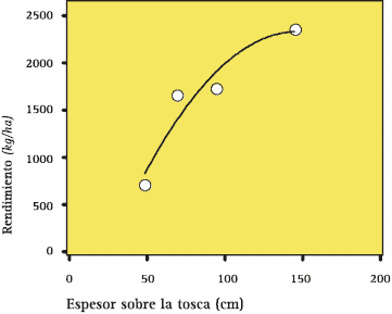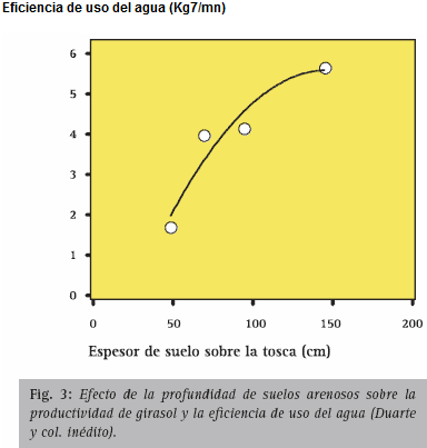 La disponibilidad de agua para el cultivo depende de varios factores ambientales y de manejo. Entre los primeros, la profundidad de los suelos junto con la capacidad de crecimiento profundo característico de sus raíces, entre otras características fisiológicas, le confiere al cultivo una alta adaptación para desarrollarse en condiciones de estrés hídrico (Sadras y Calviño, 2001). En un estudio en desarrollado en el Este de La Pampa en suelos con tosca se puede observar que en condiciones de limitada oferta de agua (60 mm durante el llenado de granos) se alcanzan los máximos rendimientos y eficiencia de uso del agua cuando la espesor de suelo sobre la tosca es de al menos 180 cm (Fig. 3).