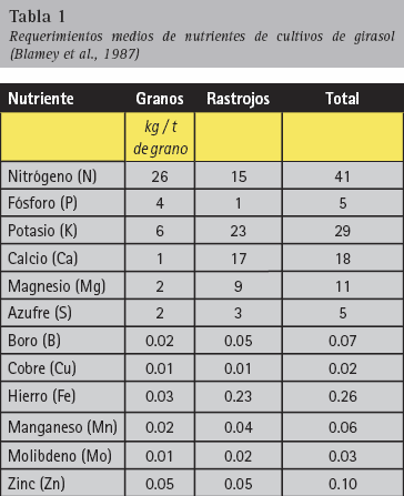 En condiciones de crecimiento con normal provisión hídrica, el girasol absorbe la mayor parte del total de nutrientes requeridos (Tabla 1) durante las etapas reproductivas de r1 a r6 (ver Caja “Estadios fenológicos del girasol según Schneiter y Miller (1981)”), siendo menor la demanda en los otros estadios. Por ejemplo, el 75 % de la absorción total de nitrógeno ocurre entre r2 y r6, mientras que entre emergencia y r2 y entre r6 y madurez fisiológica dichos valores son del 5 y 20 %, respectivamente (Uhart et al. 1998). En cambio, en condiciones severas de sequía hasta el 50% de los requerimientos nitrogenados pueden ser obtenidos durante etapas vegetativas (Scheiner y Lavado, 1999). Las necesidades de nutrientes durante el llenado de los granos son cubiertas tanto por la absorción durante esta etapa como por la movilización desde estructuras vegetativas. La estimación de la contribución de fósforo movilizado desde el tallo y hojas a semillas maduras es de al menos el 30 y hasta más del 60 %.
