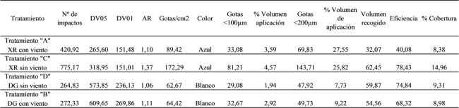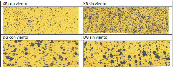 De los resultados obtenidos se desprende que la mejor cobertura (en de impactos/cm2) se obtiene con la boquilla XR y sin viento. Pero al analizar la eficacia, expresada como porcentaje de caldo aplicado que llega al blanco los valores para las pastillas DG y XR, en aplicaciones sin viento, fueron muy similares; 74.84 % y 78.43 % respectivamente. En la condición con viento la diferencia fue más amplia a favor de la boquilla XR, 68.32 % vs 40.08 % para la DG. Vale destacar que en este caso el DVM de las gotas es mayor por lo que la sumatoria del volumen de las gotas también lo es, y así también la dosis de producto aplicado que persiste sobre la maleza.