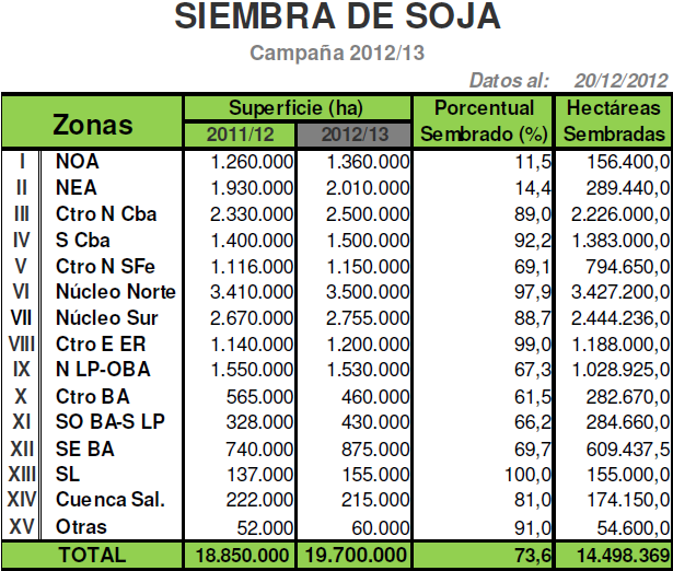Al presente informe la siembra de soja alcanzó a cubrir un 73,6 % de las 19.700.000 de hectáreas proyectadas a nivel nacional para la campaña en curso, reflejando de esta forma un progreso intersemanal de 10,3 % como así también un leve retraso interanual ahora de -2 %. En términos absolutos a la fecha se sembraron poco menos de 14,5 millones de hectáreas.
