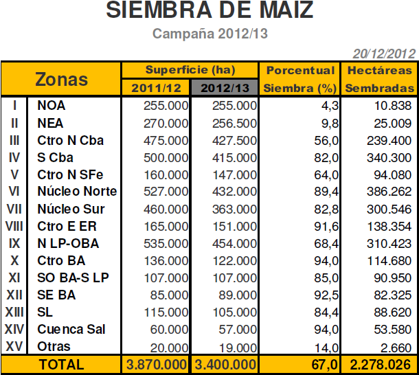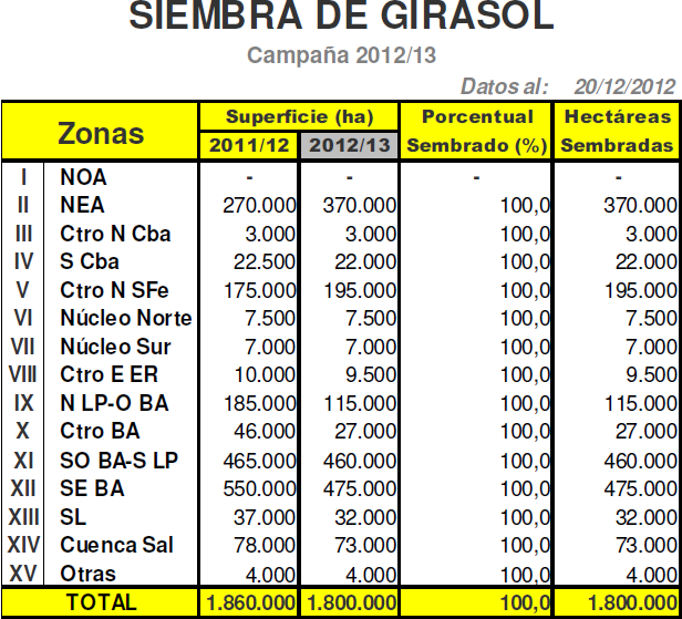 Contemplando el escenario recién descripto para los diferentes núcleos productivos de girasol y sujeto a no registrar fenómenos climáticos adversos, ya que cerca del 30-35 % del área nacional aun transita estadios vegetativos, proyectamos tentativamente una producción final para la campaña 2012/13 de 3.200.000 toneladas, producto de una superficie nacional implantada de 1.800.000 hectáreas. De lograrse dicho volumen, se ubicaría un 11,1 % por debajo del obtenido el pasado ciclo (2011/12, 3,6 MTn).