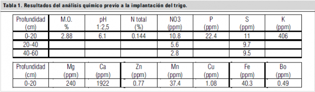 La experiencia se llevó a cabo sobre un suelo Argiudol típico serie Correa de la localidad de Cañada de Gómez. El antecesor fue maíz y los valores del análisis químico de suelo, realizado antes de la siembra, se detallan en la Tabla 1.