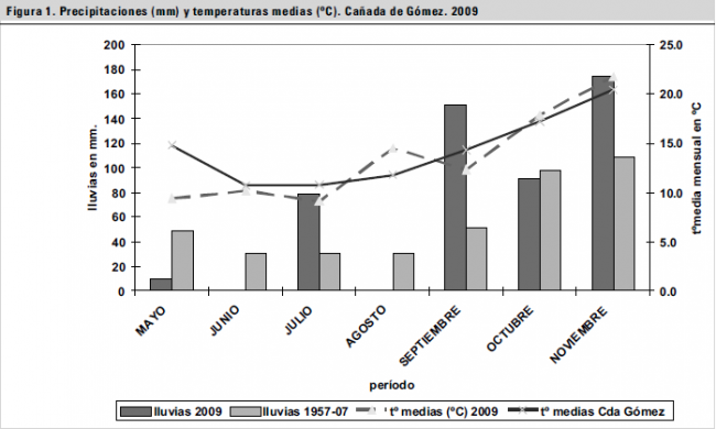 En la Figura 1 se muestran los valores de precipitaciones y temperaturas medias mensuales, registradas durante el período de crecimiento del cultivo en 2009 y se comparan con los valores medios de la localidad.