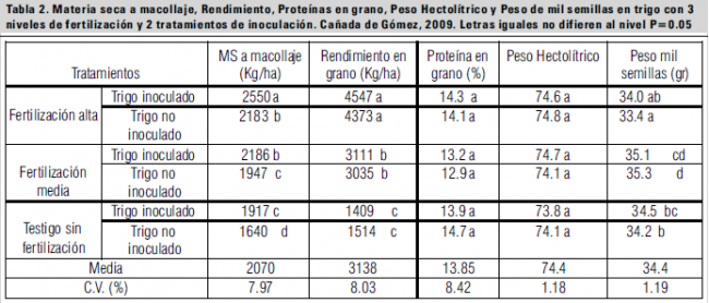 En la Tabla 2 se detallan los parámetros evaluados. La MS a macollaje mostró diferencias favorables al trigo inoculado, en todos los niveles de fertilización evaluados, con valores desde 239 kg/ha-1 hasta 367 kg/ha-1 en el tratamiento de alta fertilización.