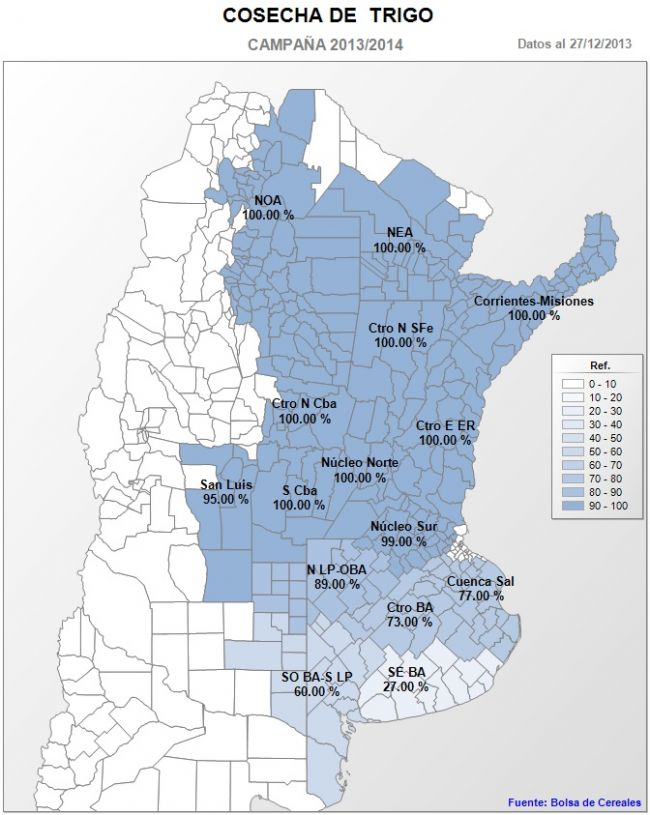 En el Sudoeste de Buenos Aires y Sur de La Pampa, la trilla se generalizo entregando rindes por debajo de los esperados. En tanto, hacia la vecina región del Sudeste de Buenos Aires, la cosecha recién comienza y se espera que hacia los primeros días de enero cobre fluidez. En esta última zona hay una fuerte expectativa respecto a elevados rindes, ya que el cultivo transito prácticamente todo el ciclo bajo buenas condiciones de humedad.