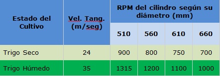 Tabla N° 1: Régimen del cilindro recomendado según su diámetro y la condición de cultivo al momento de la cosecha. Fuente: INTA PRECOP - INTA EEA Concepción del Uruguay.