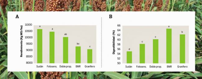Con el trabajo se pudo observar “en cuanto a rendimiento total (Figura A) que los híbridos típicamente forrajeros (Sudán y Fotosensitivos) presentan, en promedio, mayores potenciales de materia seca que los BMR y graníferos, debido a que son materiales muy voluminosos, de gran altura y alto porcentaje de tallo, respecto a otro tipo de materiales más compactos y más balanceados entre sus componentes (hoja-tallo-panoja). Por otro lado, en cuanto a digestibilidad por tipo de material (Figura B) se notó que “ocurre lo contrario, puesto que aquellos materiales voluminosos con alta fibra (sudán y fotosensitivos) presentan valores de digestibilidad muy bajos, mientras que otros materiales más balanceados, con mayor porcentaje de grano (graníferos), o baja proporción de fibra (BMR) presentan valores de digestibilidad bastante superiores.