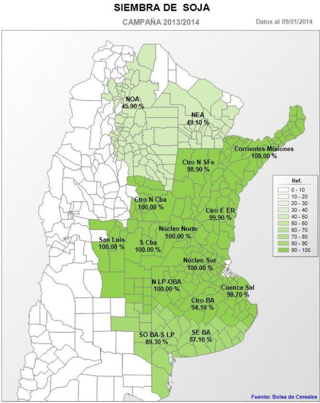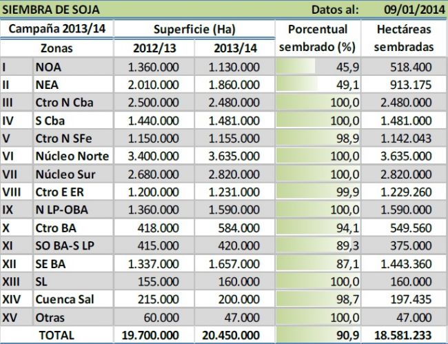 A la fecha ya se sembraron más de 18,5 MHa y luego de incorporarse los últimos cuadros de segunda, se da por finalizada la siembra en las regiones Núcleo Norte y Sur, Centro-Norte y Sur de Córdoba, San Luis y el Norte de La Pampa y Oeste de Buenos Aires.